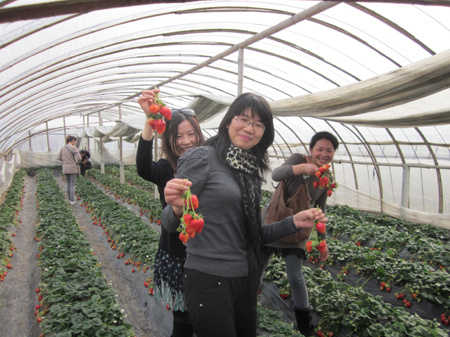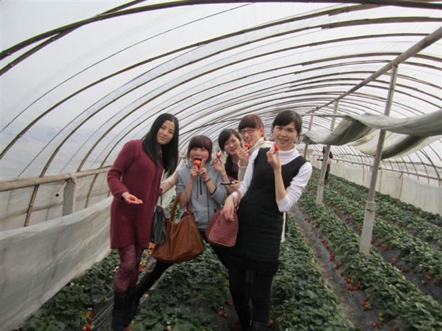 大約下午一點在農莊吃過午餐后,大家才陸續的進入草莓棚??粗锏乩铮∪缱訌?、大如拇指的草莓,忍不住垂涎欲滴。同事們都很興奮,彎著腰,輕巧地采擷,雖然果實并非個個飽滿,但笑容仍蕩漾在臉上,這場面貌似是一幅畫,染著這個春意正濃的季節。在夕陽西落前,我們便離開農莊前往天一豪食匯,共享饕餮大餐。