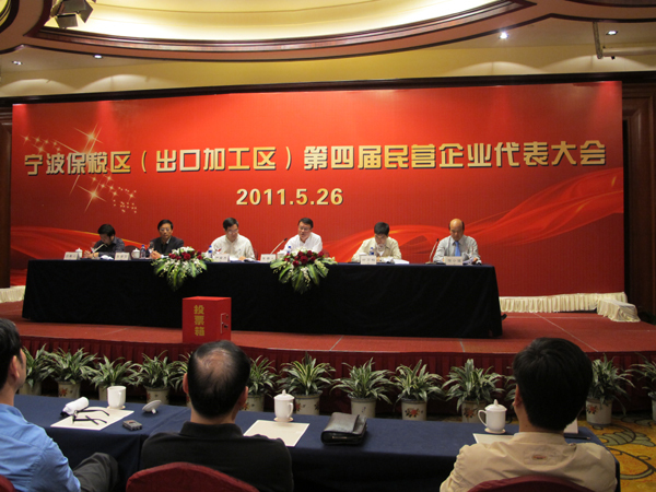5月26日下午,寧波保稅區(出口加工區)第四屆民營企業代表大會在開元名都大酒店開元廳召開。寧波市工商局副局長朱德人,保稅區管委會副主任嚴榮杰,保稅區國稅局局長柴漢本,保稅區工商分局局長徐小斌等領導參加會議。大會由保稅區工商局副局長林崇尚主持。
