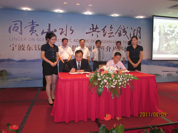 簽約的項目包括民建企業(yè)總部基地、和邦雅士莊園、東錢湖商會大廈、龍?zhí)┙】倒芾碇行摹㈠X湖水上樂園等,項目投資總額27.2億元。賽爾集團徐平炬總裁作為民建企業(yè)總部基地項目代表與東錢湖管委會主任史濟權共同簽字。晚上,管委會舉行了盛大的10周年慶晚宴,市領導、市屬相關職能委局領導、鄞州區(qū)領導、東錢湖管委會各部門以及在東錢湖投資興業(yè)的寧波著名企業(yè)家李如成、鄭堅江、王利平、樂志明、徐劍光、丁國等近300人參加了慶祝晚宴。