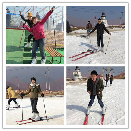到達山頂的大廳,伙伴們迫不及待地去領滑雪用具,由教練帶領著進入雪場。每個人都在認真地跟教練學做:穿雪鞋—站立—剎車—控制下滑的步驟。雪場上不時有人摔的四仰八叉,但大家都很快爬起來繼續玩耍。