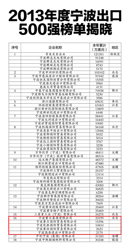 賽爾網訊,昨日,寧波市外經貿局發布了2013年度寧波市進出口額、出口額最大的前500家企業名單。在2013年度寧波市進出口、出口500強企業榜單上,集團以33386萬美元的進出口額(不包含我集團在異地注冊的控股企業的進出口金額)占據第30位,較去年同期相比,排名提升35位。出口額以33199萬美元(不包含我集團在異地注冊的控股企業的進出口金額)居排行榜第16位,與去年同期相比,排名提升20位。