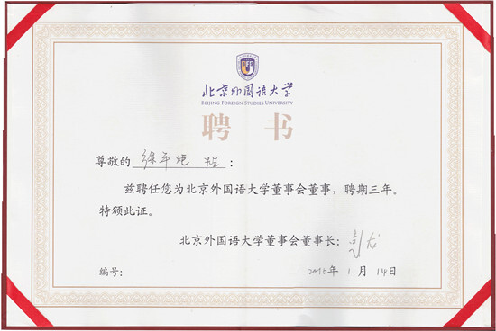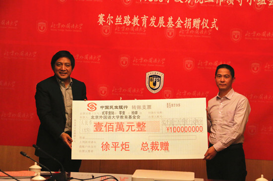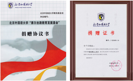 會議還舉行了“賽爾絲路教育發展基金”捐贈儀式,由賽爾集團捐資100萬元,參與共建寧波海絲研究院。彭龍校長與徐平炬總裁共同簽署了捐贈協議,北外聘任徐總為學校董事會董事,彭校長向徐總頒發了捐贈證書、校董聘書和校董名片,徐總表示非常榮幸和感謝。