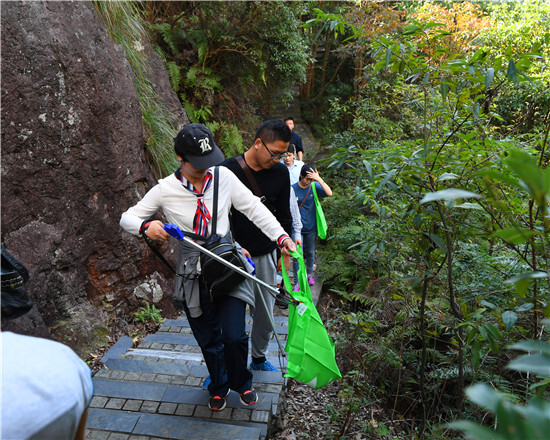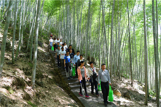 早上9點(diǎn)半,大家順利集結(jié),統(tǒng)一的“山野清風(fēng)”隊(duì)服讓我們的“大叔&美少女天團(tuán)”顯得格外清新脫俗。入秋的中坡山依然有大片大片翠綠的竹林、涓涓溪流從大石塊間流過,清脆潺緩,悅?cè)硕俊R老∵€能聞到彌漫在山谷間濃郁的桂花香,沁人心脾。在藍(lán)天白云青山綠水環(huán)繞中,小伙伴們兩人一組,沿著青石步道,一邊呼吸著山中清新空氣,一邊撿拾被粗心路人遺漏的垃圾。一路上,小伙伴們結(jié)伴而行,把垃圾當(dāng)成獵物,一些不起眼的煙頭也都統(tǒng)統(tǒng)收入囊中。結(jié)束后,大家還想給垃圾稱個(gè)重,比比哪隊(duì)撿得最多。雖然“攀比”之風(fēng)要不得,但大家對(duì)公益環(huán)保的積極性可見一斑。
