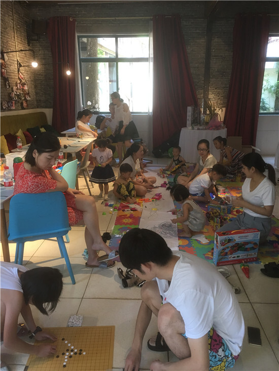 8月4日,天氣晴朗,優(yōu)景公司第一屆親子活動(dòng)在大步里院拉開(kāi)了序幕。共有13組家庭報(bào)名參加,其中3-5歲的寶貝居多。早上9點(diǎn)半,大家陸續(xù)來(lái)到大步里院,孩子們一看見(jiàn)我們?yōu)樗麄兙臏?zhǔn)備的畫(huà)板、水彩筆、印章等玩具,都迫不及待地脫掉鞋子,來(lái)到EVA墊子上,歡快地玩耍起來(lái)。