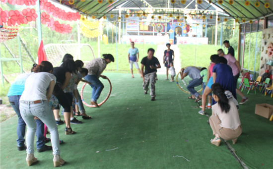 9:20分我們到達開心谷活動場地,在游戲教練的帶領下合影后開始活動熱身,抱團游戲,孩子和家長在一片歡聲笑中很快進入游戲狀態。我們正式開始第一個互動游戲:破冰起航,家長們報數,重建團隊,通過思想動員,孩子們報隊名、口號,唱隊歌;隊歌不夠響亮的團隊將接受懲罰。第一回合藍隊由于人數少隊歌嘹亮而旗開得勝。紅隊雖受懲罰,但沒有氣餒,后面的游戲再接再厲,爭取贏得勝利。