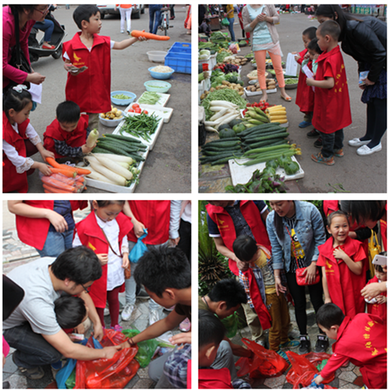 匯合后,村長把10個小朋友分為紅、黃、藍三隊并選出隊長。接著村長分發任務卡,小朋友們將根據任務卡開始今天的第一個艱巨的定向任務——獨自購買食材和尋找野炊道具。在楂林菜市場里,這些小朋友們吸引了眾多過路者的目光,每組小朋友都在認真挑選食材,詢問價格,和老板們討價還價,像個小大人。在村長的裁判下,紅隊小朋友表現最棒,買菜最多花錢最少。