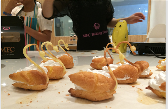 5月24日早上10:30,優景童鞋們一行12人,相約在和義大道MFC烘培教室,學習“巧克力果仁司糠”和“天鵝泡芙”的制作。低粉拌蛋、擠天鵝脖子、烤造型、加奶油,天鵝泡芙誕生啦!