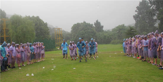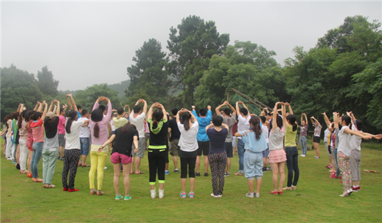 第二天早餐之后,我們100多號(hào)人在草地圍成2個(gè)同心圓,女生外圈,男生內(nèi)圈。大家手拉手站立,在教練的帶領(lǐng)下開始熱身活動(dòng)。