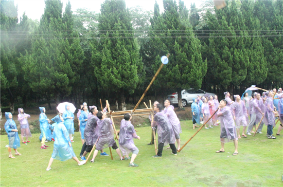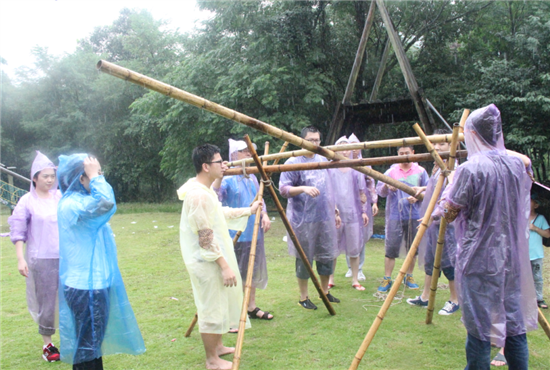 第二個(gè)團(tuán)體游戲是搭過(guò)山車。過(guò)山車的軌道是簡(jiǎn)易的PVC管搭建而成,管跟管之間用繩子,膠帶互相纏繞加固。在宏大橋梁工程面前,這些剛剛球場(chǎng)里揮汗如雨,大雨里大戰(zhàn)水球的男士們突然變成了“老練”的建筑家。在搭建的時(shí)候,他們給與了很多建設(shè)性意見。