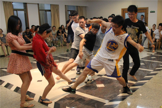 桑巴節(jié)激情的音樂(lè)此起彼伏,輕松自在的氛圍里,好玩的游戲不斷,比如泡泡糖游戲。參與者聽主持人指示,按主持人所喊人數(shù)抱團(tuán)并且做出規(guī)定動(dòng)作。當(dāng)超哥和謝總互相“捏“著對(duì)方鼻子的時(shí)候,我們都笑翻了,主持人也樂(lè)了,不斷的強(qiáng)調(diào)是“粘鼻子”……Oh my god, 這么緊張時(shí)候,誰(shuí)還分得清是“粘”還是“捏”啊?