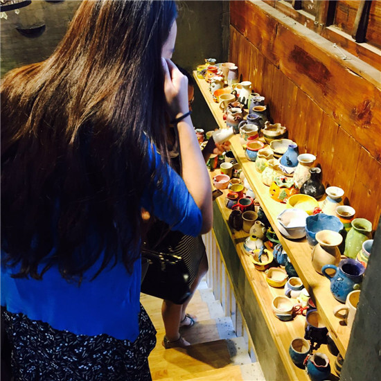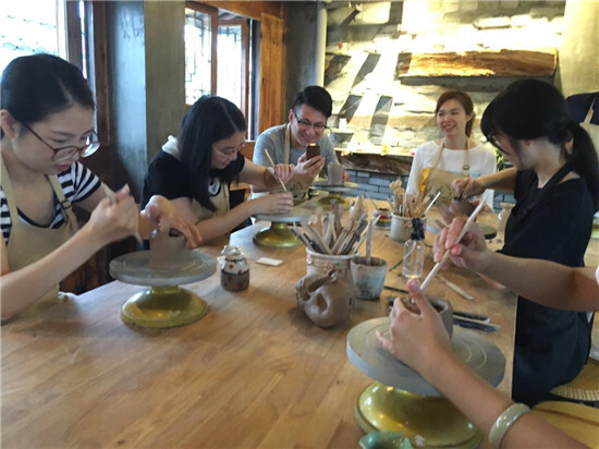 一邊在游覽,另一邊的寧波講師們已到達南塘老街手工陶藝體驗館——陶一天。進館以后,大伙系上圍兜,拿起工具,大展身手,一個個簡直就是藝術家附體,美美地創作著自己所愛的各式花瓶。