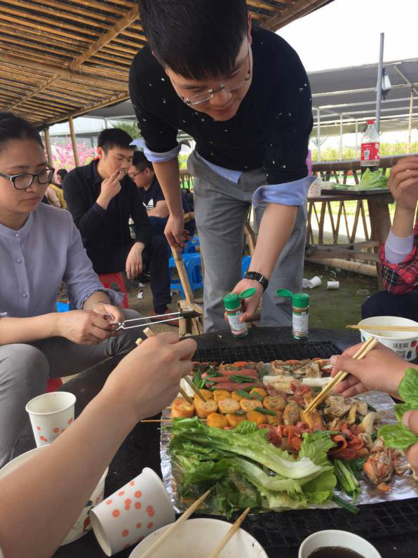 春游第一站是燒烤亭。面對(duì)已經(jīng)擺放好的豐盛食材,大家早已迫不及待地各自組隊(duì)開動(dòng)了。當(dāng)然每組的搭配也是很奇妙的,總有那么幾個(gè)拿得出手的“廚神”,也總有那么幾個(gè)“吃貨擔(dān)當(dāng)”。