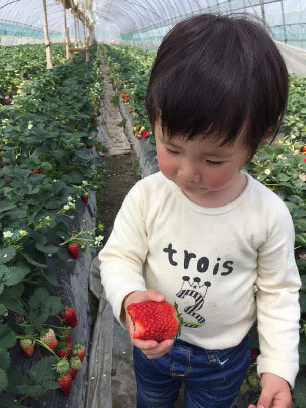 燒烤剛結(jié)束,摘草莓的消息不脛而走。大家趕緊集合起來,各自領(lǐng)兩個(gè)小籃子,目標(biāo)直指那一簇簇雪白的草莓大棚。盡管棚里非常悶熱,但就像那首歌唱得“沒有什么能夠阻擋”,看著腳邊那一個(gè)個(gè)紅彤彤的大草莓,忍不住先摘幾個(gè)解解饞,你問好不好吃?看看咱們的小公主就知道了!