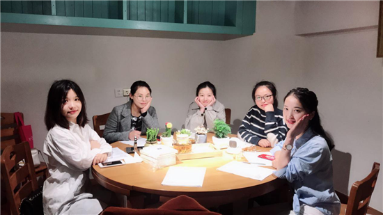 讀書(shū)日將要到來(lái),在和風(fēng)細(xì)雨的下午,我們?cè)诰碌陌材莼▓@私廚坊開(kāi)始了我們的讀書(shū)會(huì)活動(dòng)。這是翻譯社今年的第一次活動(dòng),我們通過(guò)視頻連線的方式讓寧波與義烏的小伙伴相互自我介紹,剛好大家都是美少女,熱情又積極,氛圍很是活躍,一掃之前我們以為會(huì)很尷尬的想法!(PS:男性同事可以互相推薦加入額!)
