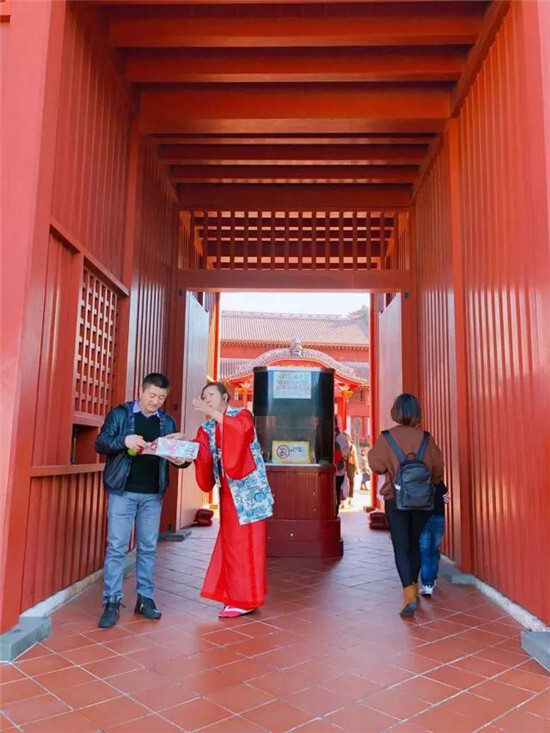 這日起得最早,8點已在酒店大廳集合,8點半就已經(jīng)坐上前往首里城的有軌電車。首里城不遠,幾站就到。下車走過一條幽靜的小道,且行且攝,不消多時,便能遠遠的看到小山丘上的巍峨建筑。朱門金漆,現(xiàn)存的首里城一派唐朝風格。古琉球國最繁盛的時期又與向中國明清兩代朝貢密不可分。故而,整個首里城中處處可見中國元素,明清文化。你最大的體驗大概便是脫了鞋子,在日本的展覽環(huán)境中看了一圈大中華的文化,哈哈~