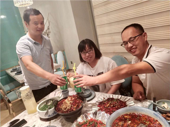 周五忙完工作后,大家步行到了聚餐點。伴隨著一些閑話家常,大家享用著美食,也很享受這份忙碌之余的閑暇時光,義烏的同事也在部門群里曬出了他們的聚餐合照,紅彤彤的川菜實在誘人!同事們相約下次去義烏再相聚。汕頭的同事小詹周末還要陪客戶,大家也向他表達了中秋的祝福。