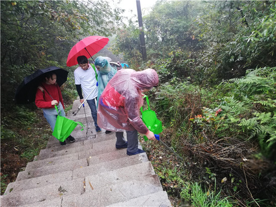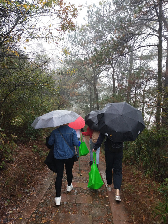 到達(dá)德勝巖山腳,新人們兩人一組自行組隊(duì),領(lǐng)取了一些工具和物資后迅速出發(fā)。秋雨唰唰地下著,細(xì)密的雨絲在山路間織起了一張灰蒙蒙的幔帳。我們或披著雨衣或撐著雨傘,小心翼翼地走在德勝巖的山路上,雖然路途艱辛,但所有小伙伴依舊神采奕奕,一路上有說有笑。新同事們一人撿拾垃圾,一人撐著環(huán)保袋,配合相當(dāng)默契。
