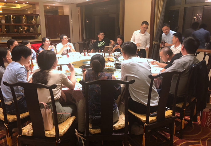 錢總因甚是思念大家,早早地就通知大家晚上要暢聊歡聚一堂。16日下班后我們?nèi)齼蓛梢惠v車陸續(xù)抵達(dá),全員到齊后,大家舉杯共同慶祝這相聚的時(shí)刻。