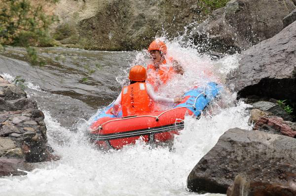 第二天我們睡到自然醒,元氣滿滿地迎接最令人興奮和向往的虎尾峽漂流。小伙伴們穿好救生衣、戴好安全帽,兩兩結伴上一艘汽艇,順著水流一直往下漂去。偶爾遇上湍急的水流,總會有一陣尖叫聲傳出,然后映入眼簾的就是兩只濕淋淋的“落湯雞”啦!漂流途中還能看到相互潑水的小伙伴,一陣陣笑聲回蕩在青山綠水之間。