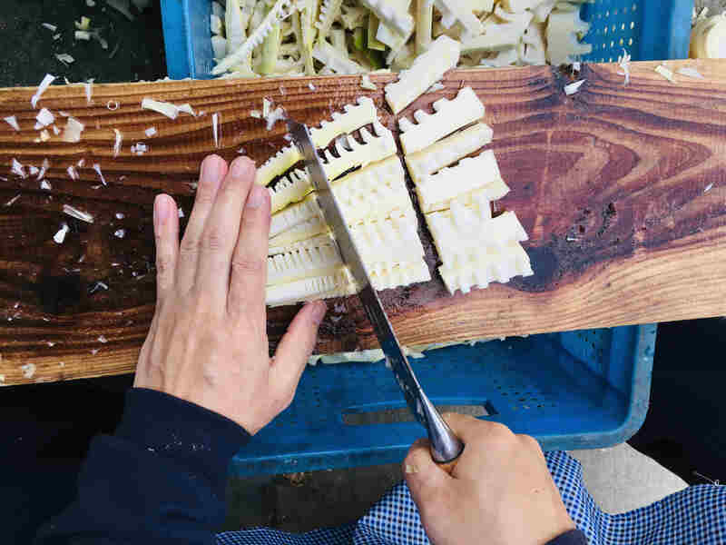 3月25日清晨,公司全員出動,分兩批陸續到達奉化毛岙村。300斤剛從竹林里運出來的新鮮筍兒,根部還帶著濕泥,在我們面前堆成一座小山。剝開殼,空氣中是一股清冽的筍香。因是第一次烤筍,姑娘們也沒少手滑,有一刀下去切了手的,有握刀久了磨出泡的,有曬瓶子結果把瓶子摔了的, 看來炊事技能堪憂。