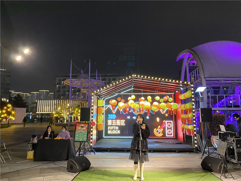 3月12日晚,愛樂社成員來到位于文化廣場的橙邑集市,趕赴一場早已約好的“音樂甜點之旅”。晚風(fēng)夾雜著些微水汽,穿行于飽足人兒的閑話與談笑中。身后搭起的方寸地界里,絡(luò)繹不絕地往來著猜燈謎的人們。階前劃出一片人造草坪,暖橘色的光似一片薄薄的輕紗籠罩,一支麥克風(fēng)靜默地立著、等待著。一首 《I don’t want to talk about it》拉開了本次街唱活動的序幕,吃瓜群眾漸漸圍攏,開始的羞澀膽怯在伴唱與掌聲中慢慢化為了動情與坦然。小朋友們是最忠實的“鐵粉”,有停下“座駕”駐足聆聽的,有主動上前伴舞的……我們的頭上懸著星星,他們的梨渦里也藏著星星。13首歌曲串聯(lián)起了如夢似幻的一小時表演,歌者與聽眾的心里鼓脹著暖洋洋的共鳴。
