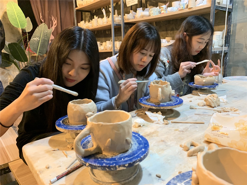 當天中午,大家約在鼓樓的“桃妝”吃飯,這是一家老網紅,菜色和環境都很不錯。最有特色的就是桃花酒啦,很值得一品,我們豪氣地一人來了一碗,干杯!午餐結束后則是最期待的陶藝DIY時間。大家各自選好想要制作的作品,開始埋頭認真制作。大家都是第一次做陶藝,手藝生疏得很,還好有老師指點,做出來的作品也都富有特色。