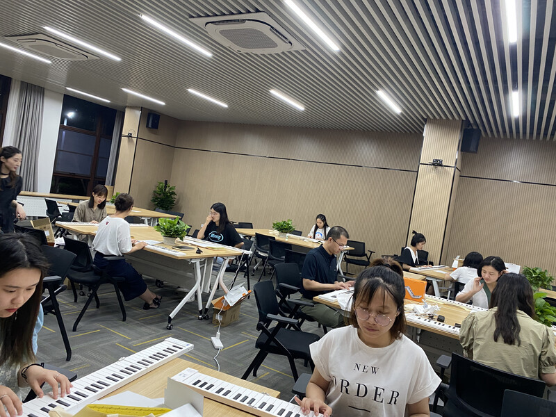 88個黑白琴鍵,15個心懷憧憬的學員,第一節(jié)課,歡歡喜喜又有點手忙腳亂,培訓室里老師耐心講解著鋼琴課的基礎(chǔ)知識,座位上學員們細心聆聽,低頭筆記。學員們?nèi)艘粋€小組,老師依次指導彈奏的姿勢和方法,教室中悠揚的旋律此起彼伏,課程慢慢接近了尾聲。通過第一節(jié)課的學習,學員們更加堅定了繼續(xù)好好學習折疊鋼琴的目標與決心。