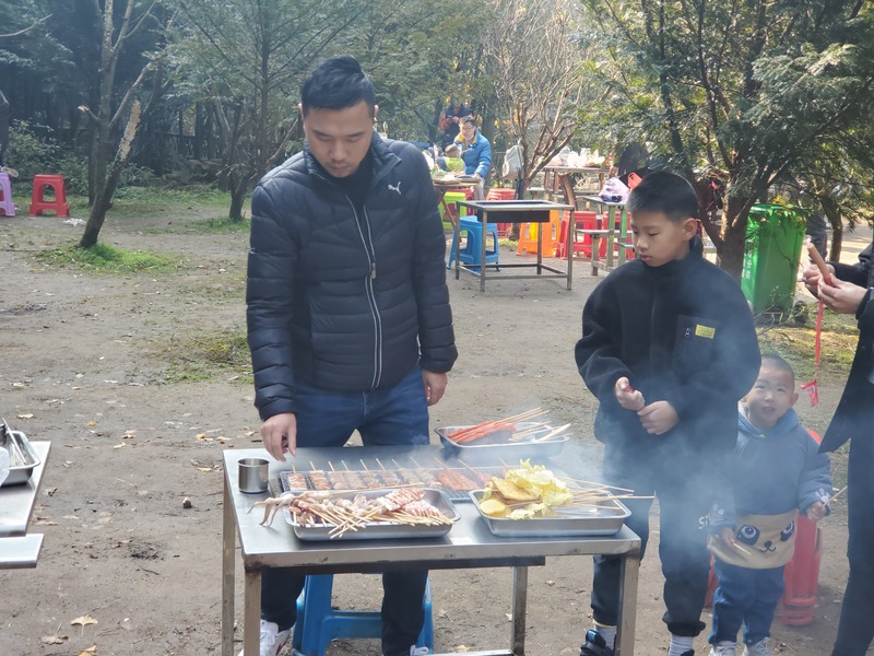 早上九點半,大伙兒整裝出發,沿途經過山路,蜿蜒曲折,能充分感受到大自然的氣息。行車一小時,我們順利抵達目的地—“云上的日子”。這里有竹橋,溪水,樹林,很安靜,偶爾還感覺能聽到鳥兒的鳴叫的聲音。等小伙伴們陸續到齊,大伙兒開始選擇食材,找到了一塊較為平坦的空地,支起燒烤攤,一個個燒烤鋪子順利“開張”。之后便是各種烤物,有烤魚、烤五花肉、烤蔬菜、烤橘子、烤香蕉等等。重頭戲要數需要提前預訂的烤雞和竹筒飯,烤雞外酥里嫩,混著孜然,椒鹽的味道,入口有幸福的感覺;竹筒飯混著豆子玉米和肉,口感糯糯的,還有一層鍋巴,讓人吃了便停不下來。大家全程歡聲笑語,吃得非常開心。