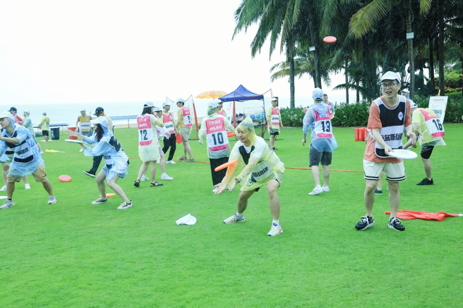 第二天便開始期待已久的團建活動---飛盤比賽和水球大戰。天公不作美,即將開始活動時,突然下起小雨,但這阻止不了我們的熱情,大家穿上雨衣,活動繼續進行。分組完成之后,首先開始練習,每項活動大家都體驗了一番,由陌生逐漸熟悉起來,各組也為比賽進行排兵布陣。在隊長和教練的帶領下,各組通過游戲進行積分,玩的不亦樂乎。