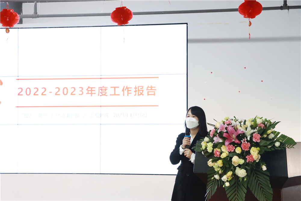 首先,副總經理黃麗作年度業績匯報。黃麗總肯定了全體同事的工作成果,2022年是受疫情和俄烏戰爭雙重影響的一年,在嚴峻的外貿大環境背景下,很多行業都受到了不同程度的沖擊,特別是對我們外貿行業的影響更是巨大的。但是優屹全體同事心往一處想,勁往一處使,在大家的共同努力下順利完成了考核目標。隨后,黃麗總就2023年提出,2023年的工作重心為持續開發、用心維護、緊抓增量,為來年的工作開展指明了方向。