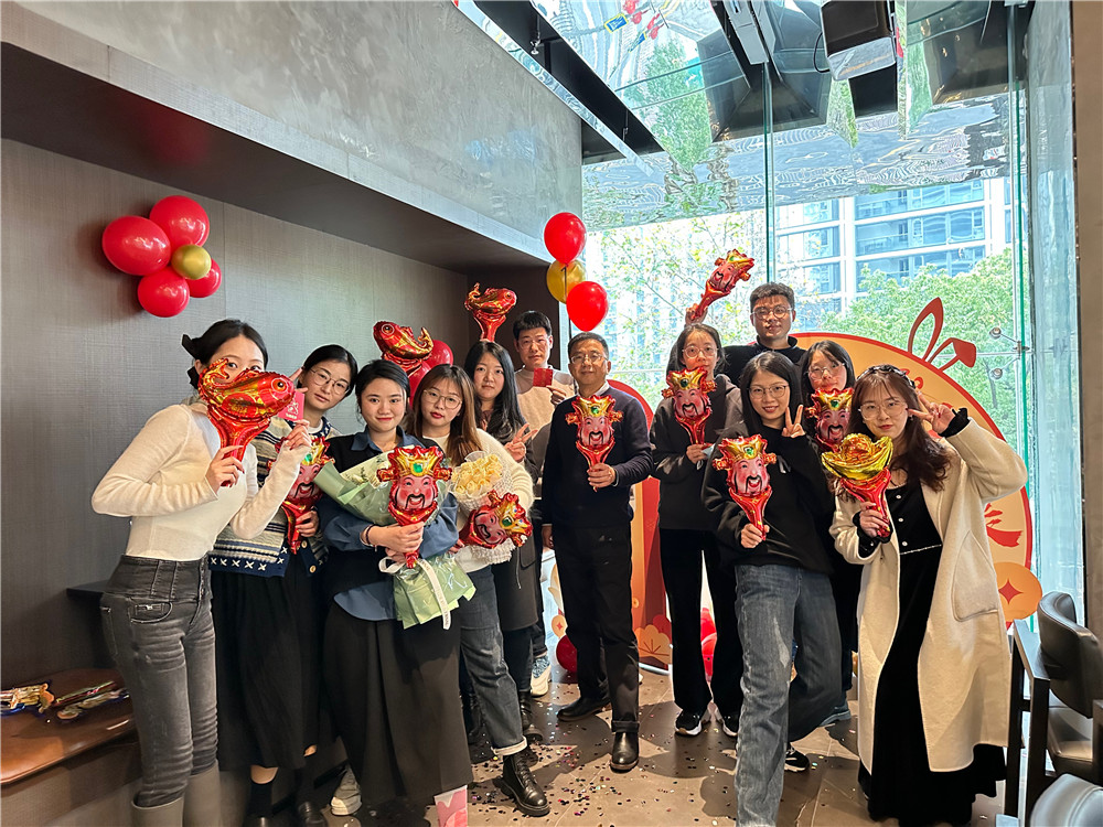 聚餐地點(diǎn)選在了希索扒房,一家有格調(diào)有氛圍的輕奢餐廳。踏進(jìn)包廂,映入眼簾的是繽紛的氣球,兔年元素的紅包墻,豪華的年會(huì)獎(jiǎng)品,還有屏幕上大家的新年寄語(yǔ),精心的準(zhǔn)備籌劃讓這場(chǎng)年會(huì)更具溫度。進(jìn)入餐廳后,我們先用拍立得和小禮炮進(jìn)行了打卡簽到。雞樅菌炸蝦、煎鵝肝、火腿拼盤、烤牛排……隨著一道道精美的菜品上桌,經(jīng)典的抽獎(jiǎng)環(huán)節(jié)也隨之而來(lái)。抽獎(jiǎng)后是獲優(yōu)和晉升人員表彰環(huán)節(jié),蟬的幼蟲(chóng)脫殼羽化為健壯的成蟲(chóng),寓意公司新生力量源源不斷進(jìn)入,義烏人資部門的小伙伴詩(shī)宇也實(shí)現(xiàn)從新人到中堅(jiān)力量的跨越;而在義烏招聘組持續(xù)發(fā)光發(fā)熱、一馬當(dāng)先的萱萱也被晉升為人力資源部的中級(jí)專家。吃飽喝足后來(lái)到了激動(dòng)人心的壓軸大獎(jiǎng)抽取環(huán)節(jié)。在萬(wàn)眾矚目之下,最終大獎(jiǎng)被新人楠楠斬獲。在歡聲笑語(yǔ)中,我們手持紅包和氣球拍了大合照留念。