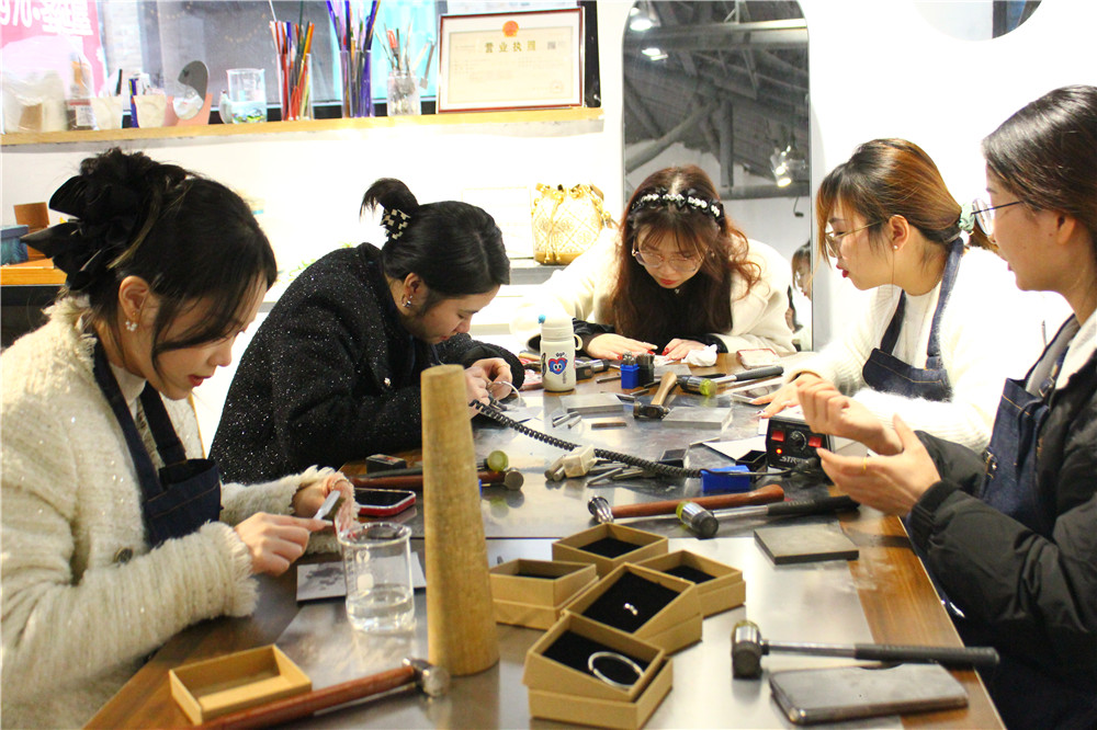 下午大家到沐生銀飾進(jìn)行銀鐲DIY活動(dòng)。在老板和店員小姐姐的指導(dǎo)下,我們一步步操作:刻字,紋路雕琢,再到成型和打磨,共用了2個(gè)小時(shí)。看著銀條華麗變身成手鐲,我們的汗水和付出也算是值得了。老板還友情贈(zèng)送了許愿牌和祈福布條,我們將新年愿望寫下,帶著美好的祈愿將許愿牌掛在了門外的大樹(shù)上。