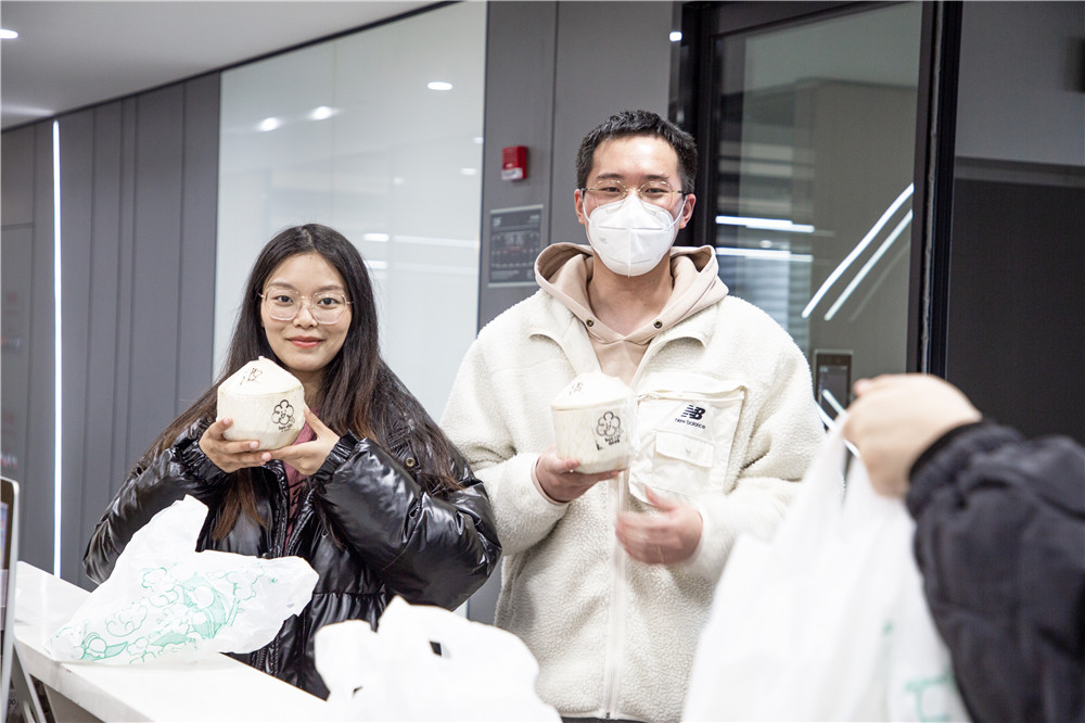 正是下午倦怠時分,聽到召喚聲,大家紛紛涌向了茶水間,驚喜中看到桌上擺滿形形色色的椰子凍還有誘人的小糕點,大家圍成一個大圈,每個人挑選著自己鐘意的口味,吸入一口,嘴中布滿甜意,又互道一聲甜蜜的祝福。愉悅的時刻,讓每個人都放松了身心,時光是如此讓人美好而溫暖。