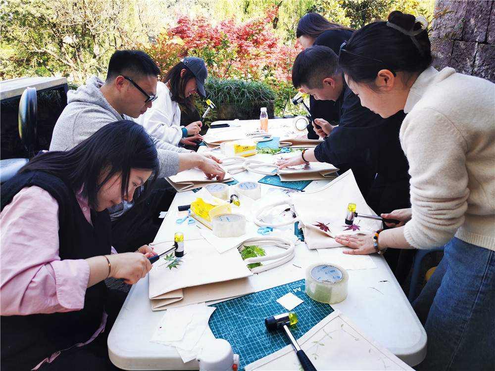 午餐后,小伙伴們有的在莊園閑逛消食賞景,有的沉迷棋局對弈,還有的在溫暖春風里安靜午睡。小憩過后開始下午手工活動——植物敲染帆布包,把植物粘貼在帆布包上用錘子用力敲打出汁水,然后撕去膠帶即可。操作步驟簡單卻是實實在在的體力活,大家舉著錘子叮叮當當沒一會兒開始手臂發酸,但沒有一位輕言放棄,甚至為了更好地發力都站著敲打。最后大家在一片歡聲笑語中完成了各自的作品。