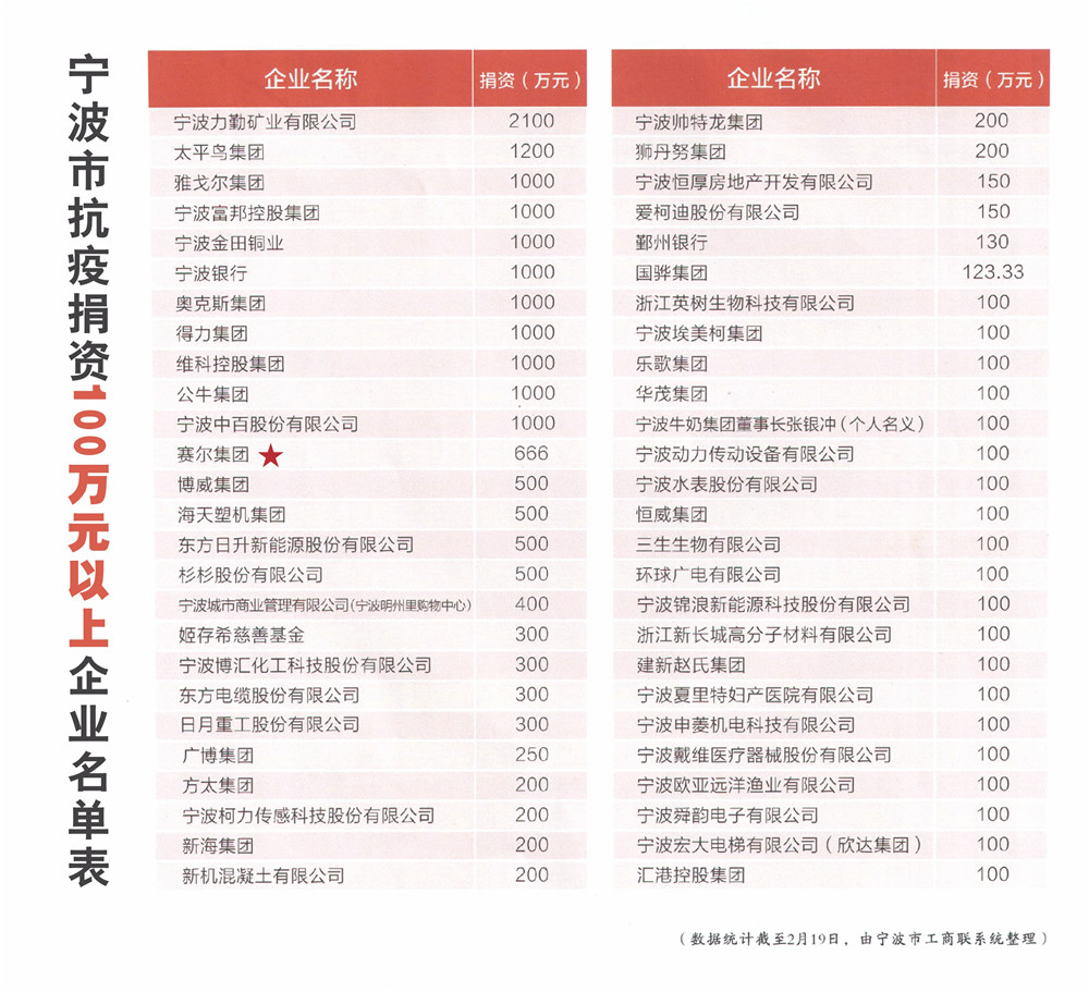 2016年1月,向寧波海上絲綢之路研究院捐資100萬元。集團“賽爾親風基金”再次捐贈10萬元用于關愛江東區失獨家庭。