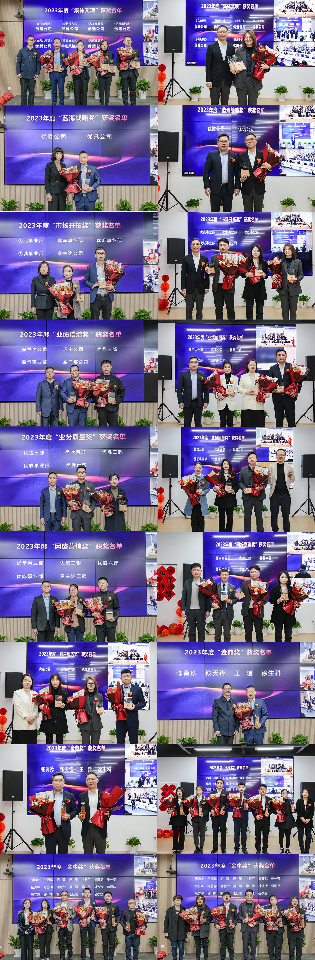 會議舉行年度重要獎項(xiàng)頒獎儀式。23年度集團(tuán)設(shè)立集體獎項(xiàng)7個,優(yōu)景公司榮獲文化建設(shè)獎和學(xué)習(xí)組織獎,優(yōu)騰公司榮獲協(xié)同共享獎和清廉建設(shè)獎,優(yōu)越公司榮獲創(chuàng)新活力獎,優(yōu)遠(yuǎn)公司榮獲人才磁石獎,集團(tuán)單證風(fēng)控部榮獲信息安全獎。23年集團(tuán)設(shè)立團(tuán)隊(duì)獎項(xiàng)6個,分別是藍(lán)海戰(zhàn)略獎、市場開拓獎、業(yè)績倍增獎、業(yè)務(wù)質(zhì)量獎、網(wǎng)絡(luò)營銷獎和客戶服務(wù)獎,共有21個業(yè)務(wù)團(tuán)隊(duì)獲得獎項(xiàng)榮譽(yù)。藍(lán)海戰(zhàn)略獎由優(yōu)勝公司和優(yōu)訊公司獲得,該獎項(xiàng)要求對新業(yè)態(tài)模式敏感,業(yè)務(wù)布局前瞻性強(qiáng),有示范性新項(xiàng)目落地成功,公司業(yè)務(wù)布局成為集團(tuán)重要業(yè)務(wù)賽道之一,陳勇珍和錢天鋒分別代表各自公司領(lǐng)取藍(lán)海戰(zhàn)略獎,所獲榮譽(yù)實(shí)至名歸。23年度陳勇珍、錢天鋒、王建、徐生科等四位業(yè)務(wù)總經(jīng)理獲得個人獎項(xiàng)的最高榮譽(yù)金鼎獎,該獎項(xiàng)歷來以競爭激烈著稱,四位獲獎?wù)邞{借著業(yè)務(wù)規(guī)模、高速增長和盈利能力摘得金鼎桂冠。2023年度共有20位業(yè)務(wù)負(fù)責(zé)人憑借部門優(yōu)秀業(yè)績,榮獲個人金牛獎項(xiàng)并現(xiàn)場上臺領(lǐng)獎。