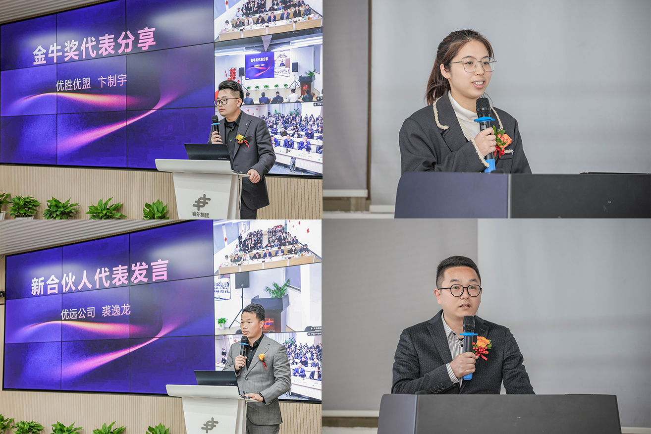 會議進(jìn)行了新入合伙人簽約儀式。王淑樂、孫榕、謝智娟、方慧芳、金曉霞、李培斯、黃偉堒、劉鋒、裘逸龍、胡勇奇、劉慧兒、倪浩、金繼紅、張水清、鐘笑寒、雷雁、汪宏偉、劉艷、王正強(qiáng)等19位骨干同事成為新合伙人。徐平炬董事長和錢天鋒聯(lián)席總裁分別與新合伙人簽約。優(yōu)遠(yuǎn)公司裘逸龍和優(yōu)達(dá)公司張水清代表新合伙人分別發(fā)言。裘逸龍回顧了職業(yè)發(fā)展歷程,他表示部門業(yè)績持續(xù)增長,得益于集團(tuán)平臺資源支持、公司機(jī)制助力以及業(yè)務(wù)團(tuán)隊(duì)凝心聚力。優(yōu)達(dá)公司張水清結(jié)合本人工作感悟和跟單部門工作實(shí)際,聚焦大客戶跟單流程與關(guān)鍵節(jié)點(diǎn),跟單人員績效考核方式等方面進(jìn)行了重點(diǎn)展示說明。