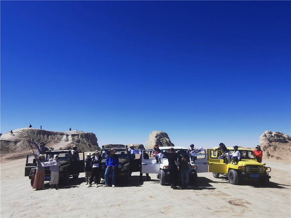 沿著315國(guó)道,第二站是獨(dú)一無(wú)二的水上雅丹。在這里,大家五人一組,進(jìn)行了一場(chǎng)緊張刺激的越野賽。穿梭在戈壁與湖泊之間,顛簸崎嶇的小路也阻擋不了小伙伴們激動(dòng)的心情。在你追我趕中,不僅看到了雅丹風(fēng)景之美,在聊天打趣中,也讓大家彼此之間有了更深的了解。