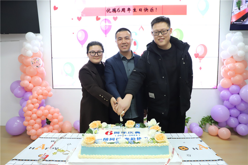 隨后,優(yōu)騰總經(jīng)理徐生科上臺致辭,帶領(lǐng)大家回顧了上一年的成果,并對下一年的發(fā)展做出了寄語。之后生科總和副總監(jiān)俞飄飄、副經(jīng)理王喬蓬上臺一起為優(yōu)騰切生日蛋糕,全場齊唱生日快樂歌。