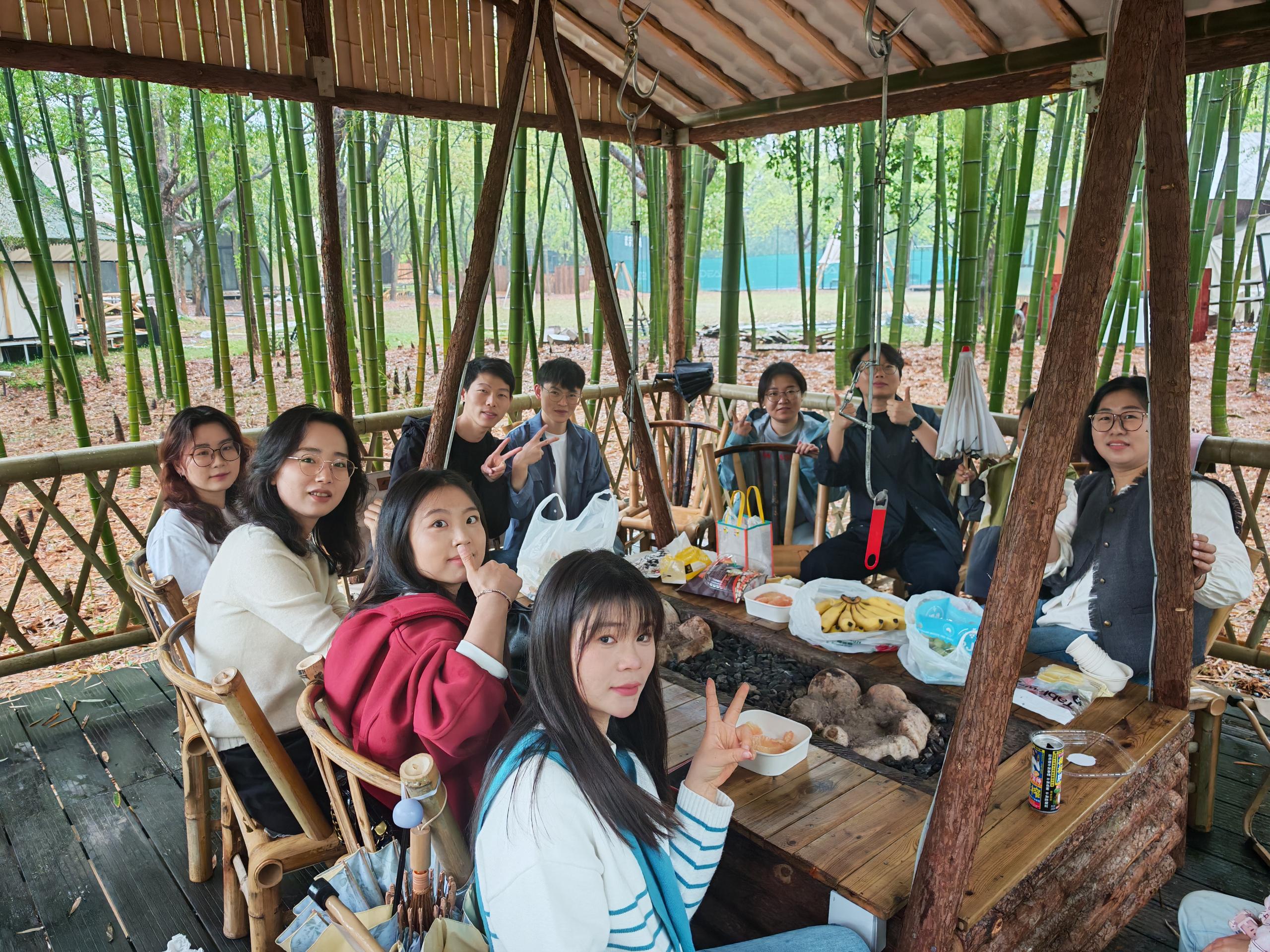 隨后,大家移步至 “棲城鹿” 竹林烤肉場地,享受豐盛的韓式烤肉午餐。在竹林的清幽環境中,成員們圍坐一起,一邊品嘗美食,一邊分享工作中的點滴趣事,部門氛圍其樂融融。