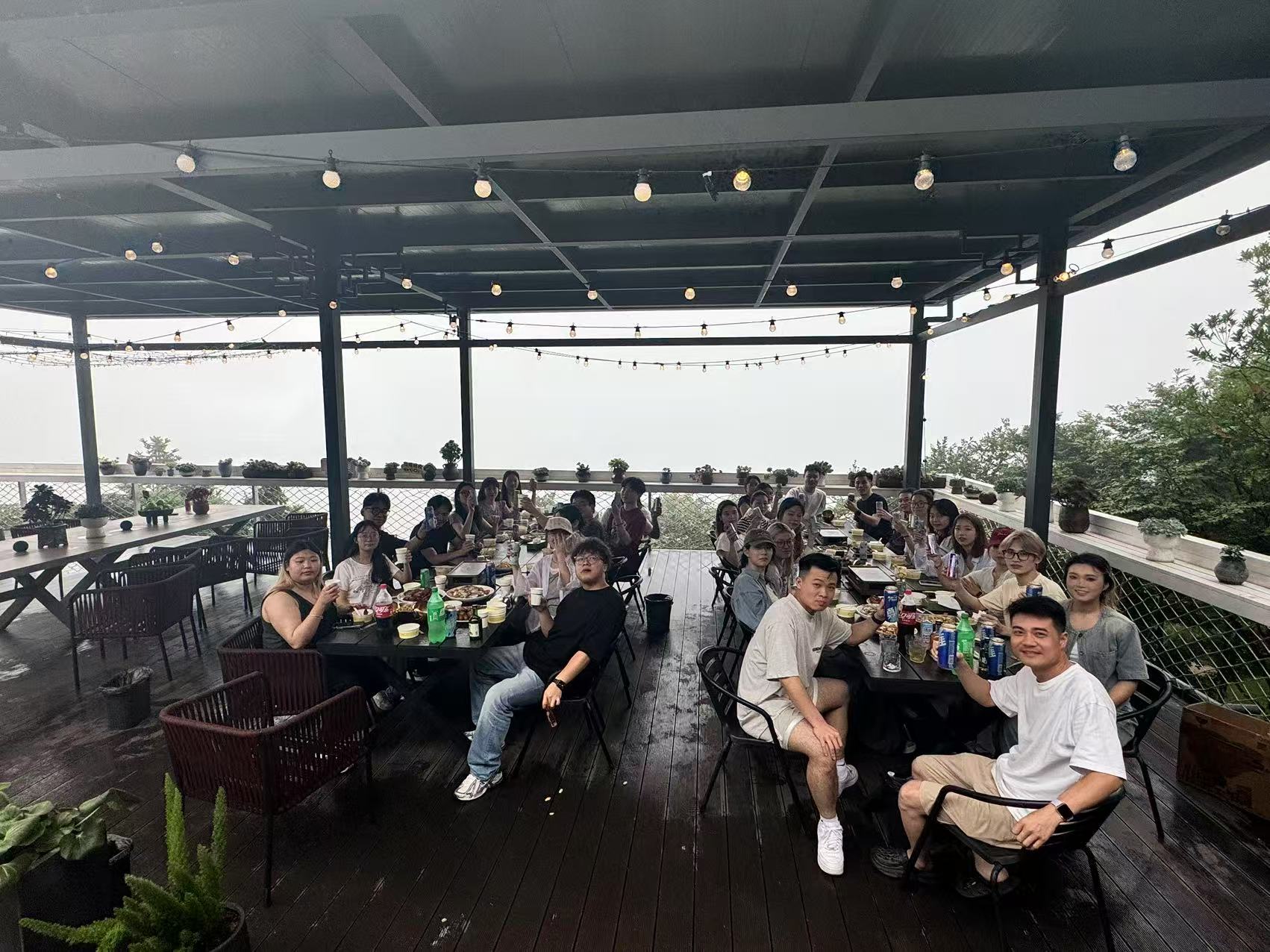 山風漸涼時,雨聲淅淅瀝瀝。天空一聲巨響,采購部頭號一姐拿著麥克風跟著駐場的鋼琴手開始show time,一首清美悠揚的歌聲驟然響起,為晚餐拉開了完美的序幕。長桌上擺滿了熱氣騰騰的菜肴,冰鎮的啤酒與飲料冒著細密的氣泡,大家圍坐在一起,邊吃邊聊。舒緩的旋律在山間流淌,混著飯菜的香氣與大家的談笑聲,格外愜意。